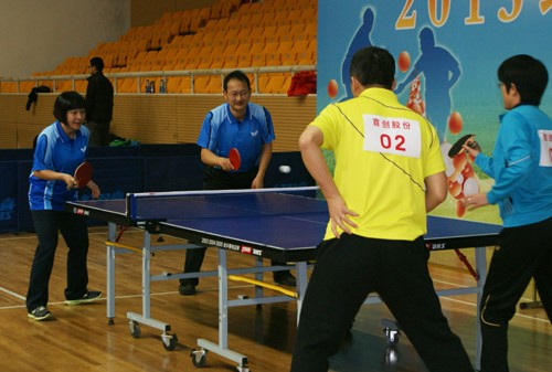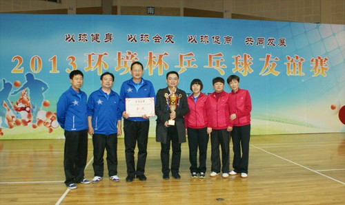 在决赛中,杭州锦江集团代表队是一块难啃的“硬骨头”:对方一号球员使用一面生胶一面长胶的特制球拍,打过来的球又沉又飘。我方队员很不适应,在开始的对抗中处于下风。在先输一场、落后一分的不利形势下,我方队员相互支招、相互鼓劲,越战越勇,士气如虹!在接下来的比赛中连赢三场,一举夺得“2013环境杯”团体冠军。