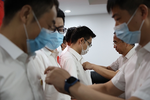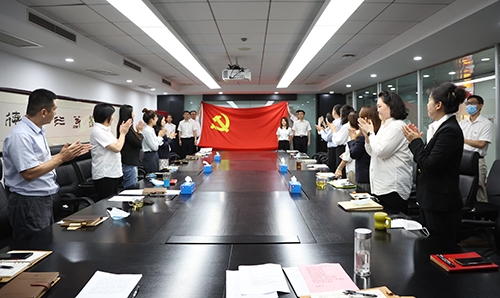 会上,新党员向党旗宣誓,全体党员同志重温入党誓词。公司领导与支部书记为新党员佩戴党徽后,大会举行了庄严的党旗传递仪式---老党员将鲜红的党旗传递给年轻的党员同志,同时也将党的光荣传统和优良作风传递给他们。随后,新党员代表李沫作了激动人心的表态发言。