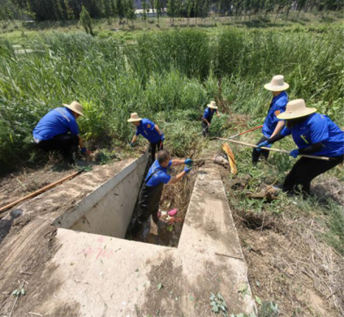 觅子店污水处理站退水口距离水厂600米左右,位于大梁沟;永乐店第二污水处理站退水口距离水厂500米左右,位于凤河;两处退水口周围杂草丛生、藏污纳垢。志愿者们不畏现场恶劣环境,拿起耙子、镰刀、铁锹等工具,纷纷进入作业状态。经过三个多小时的奋战,两座水厂退水口的地上、地下焕然一新,经过处理的污水清澈、顺畅地排入河道。