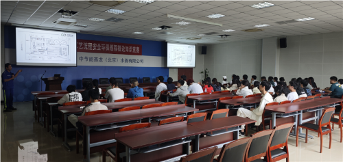 在公司综合楼大会议室,工艺工程师黄艳海通过PPT演示的方式为师生们讲述整个污水工艺流程和处理工艺。